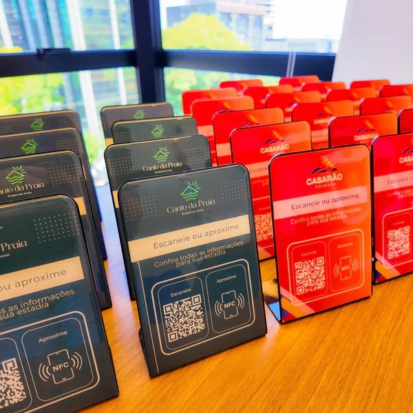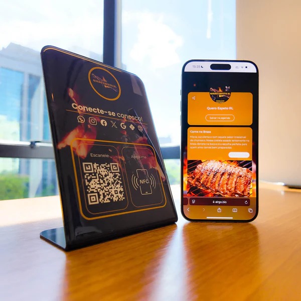 • Chip NFC embutido para leitura por aproximação e QR Code integrado para direcionar seus clientes à sua página personalizada Airgo, onde é possível: